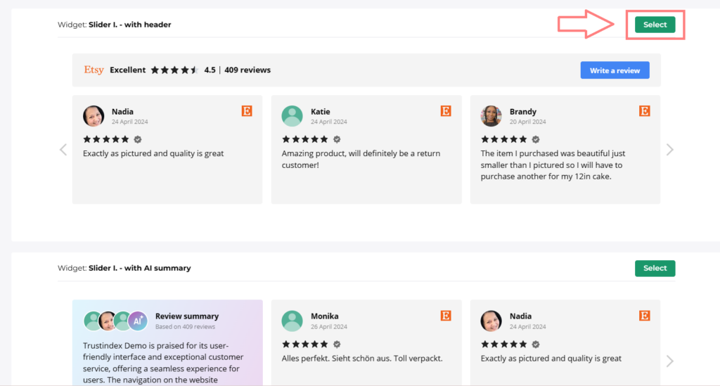 One of our most exciting features is the new review widget layout: Slider I. with AI summary.