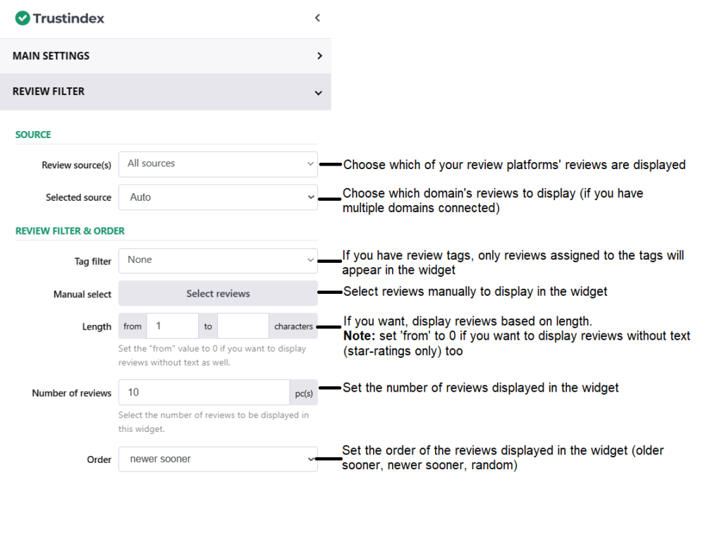 The Review Filter settings include: