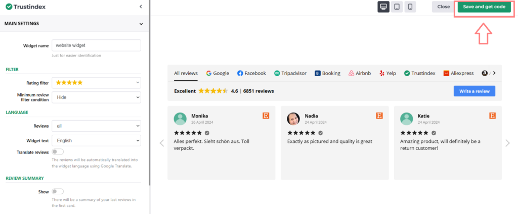 Finally, click on the Save and get code button on the top right where you will find the shortcode for your own review widget.