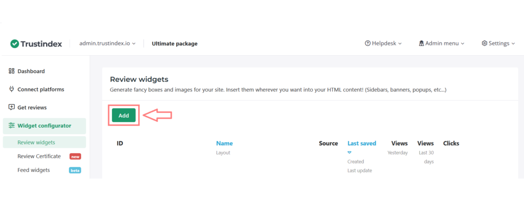 After logging in to your Trustindex account, navigate to the Widget Configurator Menu and choose Review Widgets. In the review widgets menu, click on the Add button.